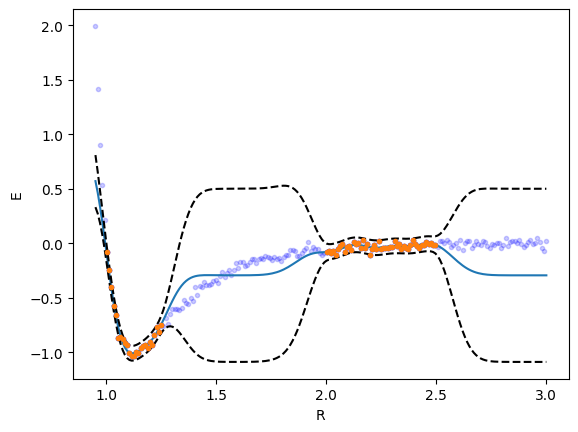 from sklearn.gaussian_process import GaussianProcessRegressor from sklearn.gaussian_process.kernels import RBF, WhiteKernel kernel = RBF() + WhiteKernel() gpr = GaussianProcessRegressor(kernel=kernel, random_state=0, normalize_y=True).fit(_R, _y) plt.plot(_R, _y, 'b.') plt.plot(r, y, 'b.', alpha=0.2) yp, se = gpr.predict(r[:, None], return_std=True) plt.plot(r, yp) plt.plot(r, yp + 2 * se, 'k--', r, yp - 2 * se, 'k--'); plt.plot(_R, _y, '.') plt.xlabel('R') plt.ylabel('E'); gpr.kernel_
